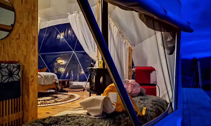 搭建在景區(qū)的星空球型露營帳篷是一道特別的風景線,特別的外觀加上高端的室內設計,豪華程度不亞于5星級酒店房間,獨特的外形設計巧妙的與大自然景色融為一體。
