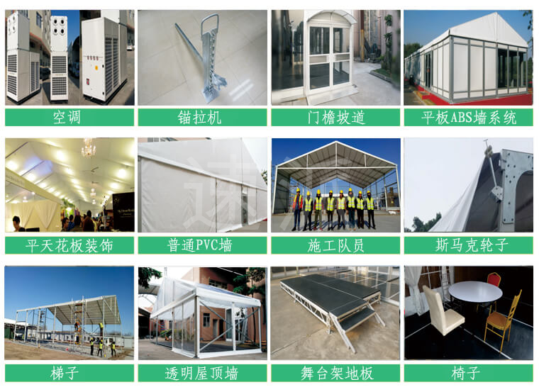 我司嚴(yán)格執(zhí)行ISO9001的質(zhì)量管理體系,確保不良產(chǎn)品的最小化及客戶滿意度的最大化。我們的的主要產(chǎn)品包括可移動(dòng)的模塊化鋁合金支架篷房,有不同風(fēng)格的篷房及裝飾可供選擇,篷房跨度從3米到60米。此外,還包括錐頂篷房和吊頂篷房,以及篷房配件,如照明燈具、地板、空調(diào)、桌椅及其它用于篷房?jī)?nèi)部的家具。篷房可廣泛應(yīng)用于大小型活動(dòng)、婚慶、展會(huì)、體育、酒店、航空和工業(yè)等其它領(lǐng)域。篷房框架結(jié)構(gòu)為高強(qiáng)度鋁合金6061/T6型材,篷布為防水、阻燃的雙面PVC涂層聚酯纖維布,主體結(jié)構(gòu)風(fēng)載荷不少于100Km/h。